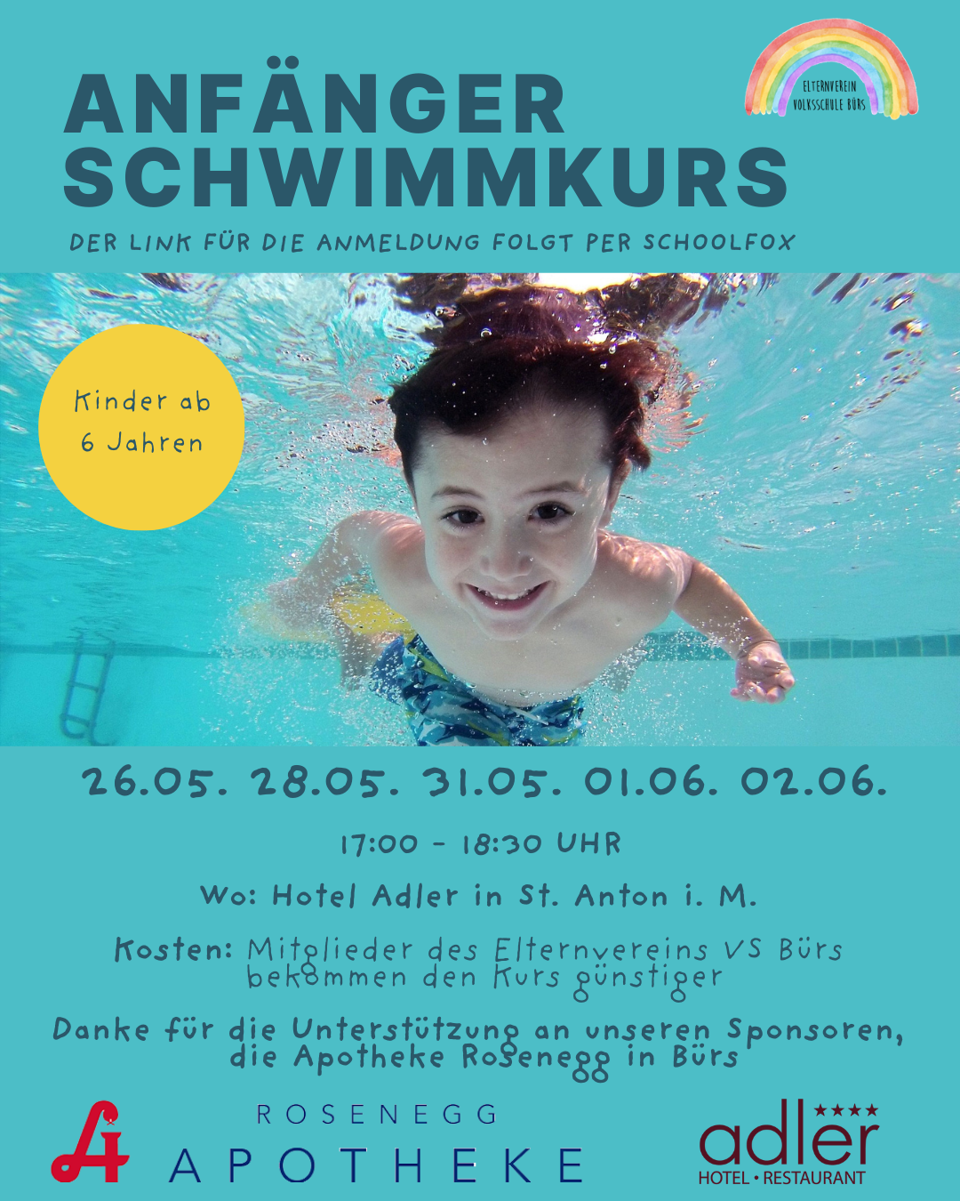 Der Elternverein der VS Bürs organisiert einen Anfängerschwimmkurs für Kinder ab 6 Jahren. Ziel des Kurses ist es, den Kindern spielerisch Sicherheit im Wasser zu vermitteln und erste Schwimmkenntnisse aufzubauen.